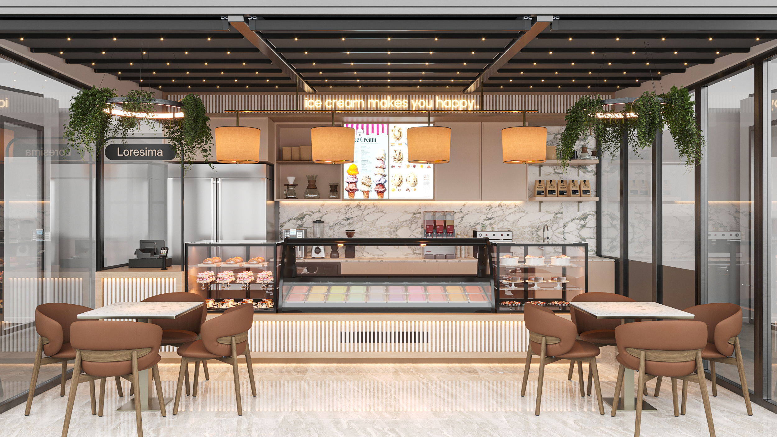 Bu dondurmacı, sıcak ve davetkar bir atmosfer yaratmak amacıyla tasarlanmıştır. İç mekan, sıcak renklerle döşenmiş olup, ziyaretçilerine samimi ve rahat bir ortam sunmaktadır. Her detay, keyifli bir deneyim yaşatmak için özenle seçilmiştir. Burada, tatlı bir molanın keyfini çıkarabilirsiniz.